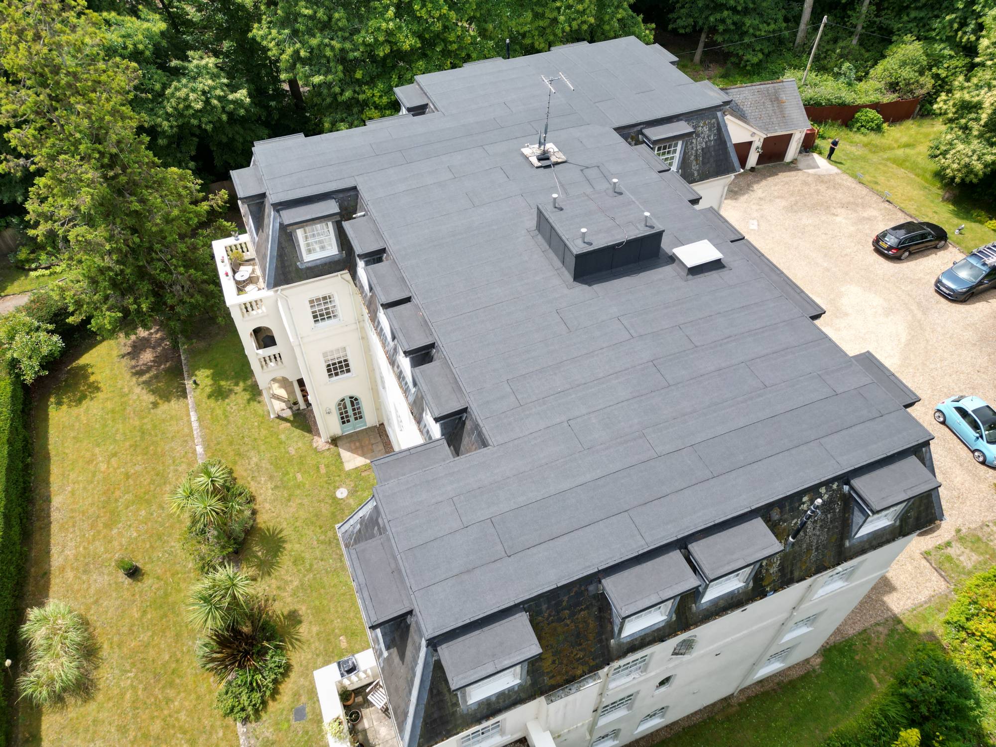 We were appointed to carry out a full flat roof replacement and extensive dormer refurbishment on a prestigious white-rendered property near Petworth, West Sussex, formerly part of the historic Petworth Estate. The works included replacing approximately 270m² of flat roofing with a high-performance Garland system, the refurbishment of 26 dormer tops with new leadwork and waterproofing, the installation of a new roof access hatch, and careful slate reinstatement to the mansard slopes. Completed in line with NFRC Safe2Torch guidelines and Garland UK specifications, the project now benefits from a 25-year insurance-backed guarantee, ensuring long-term durability and protection.