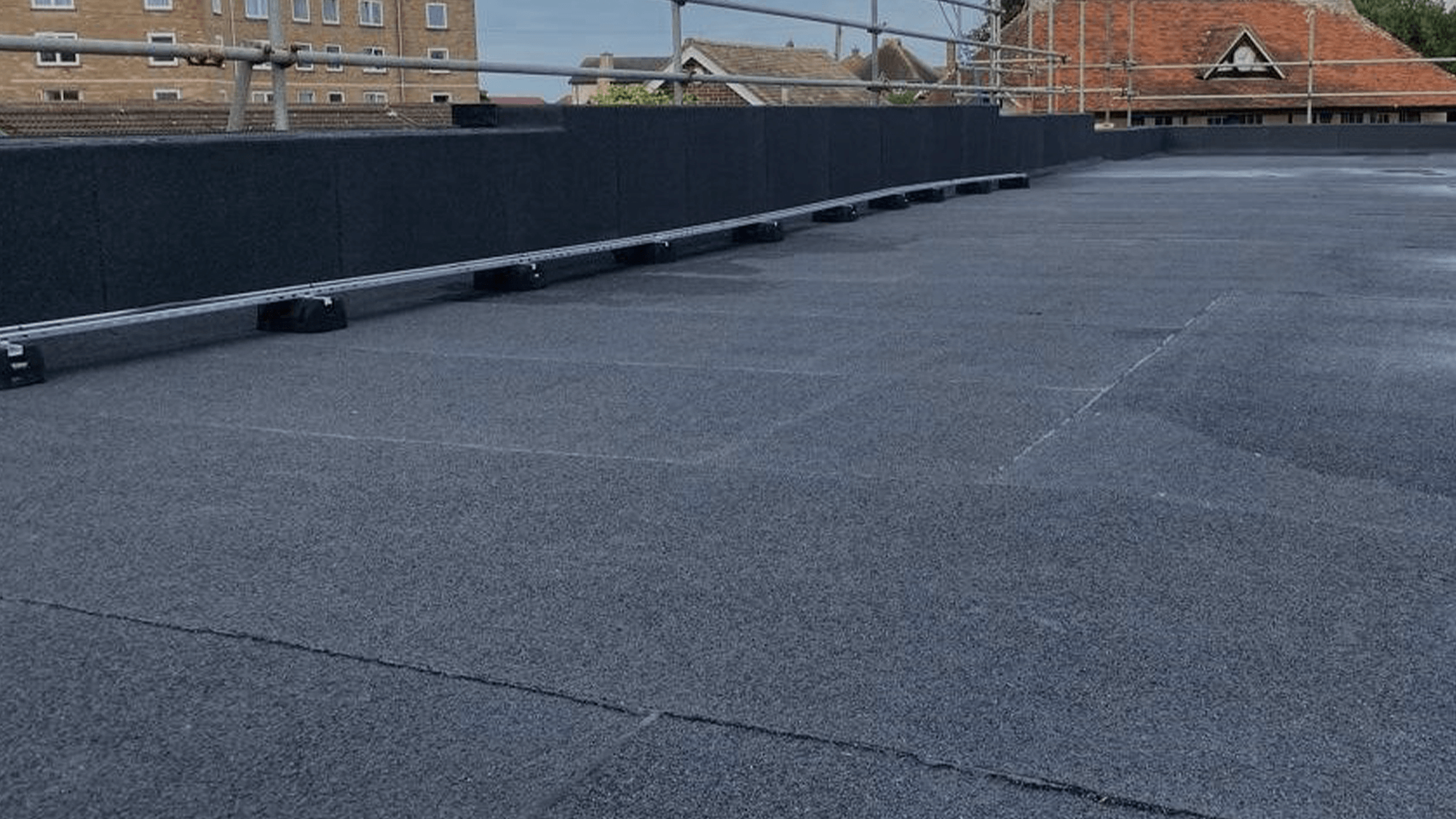 The flat roofing team prepared the existing roof covering, created new frames using 18mm exterior grade plywood to the abutment walls and on top of the copings which gave a nice square finish. We then installed an IKO high performance felt waterproofing system.